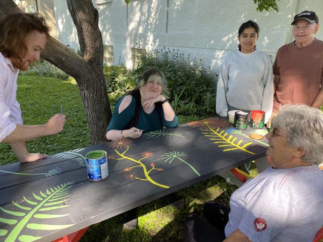 We were pleased to construct the picnic table near the end of June and had a few volunteers prime and paint the table in July. We had some artistic members that started painting the floral scene and there were often people from the congregation or in the neighbourhood who stopped by to talk, help out with artwork, or make suggestions. The artists worked on several different days over the month to complete the project. We are planning to have a community potluck barbeque at the end of summer and hope that neighbours will see our sign that reads, “For everyone born there is a place at our table. Join us!” and accept the invitation.