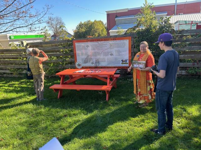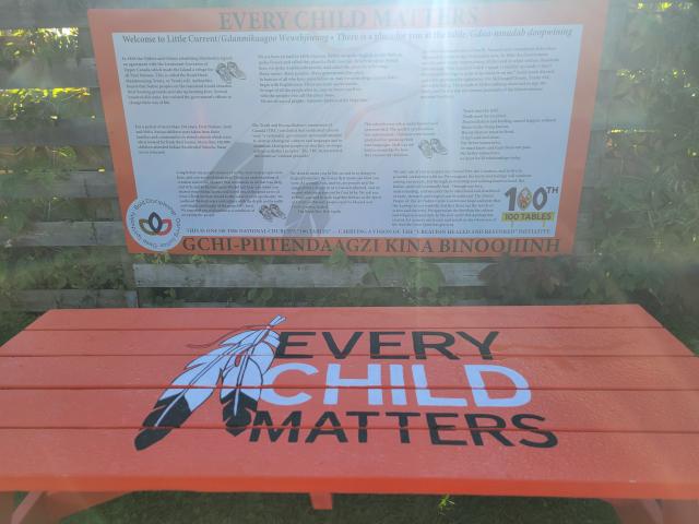 We are not reconciled. Although 10 years have passed since the Truth and Reconciliation Report, and 39 years since the church's apology, most Calls to Action are unfulfilled and racism continues in the church. There is living, and generational, trauma that continues to impact us. There is living, and generational, shame that continues to harm us. Unless we face the truth, unless we mourn together, weep together, and work together, we won't ever find harmony among all our peoples, faiths, and traditions. Manitoulin is a tourist destination, and over the summer thousands visit the island. We hope this table right in the middle of Little Current's downtown will be an inviting place for people to eat lunch. Then, they'll read the signage: "Welcome to Little Current. Gdanmikaagoo Wewebjiwang. There is a place for you at the table. Gdaa-nmadab doopwining. Every child matters. Gchi-piitendaagzi kina binoojiinh."