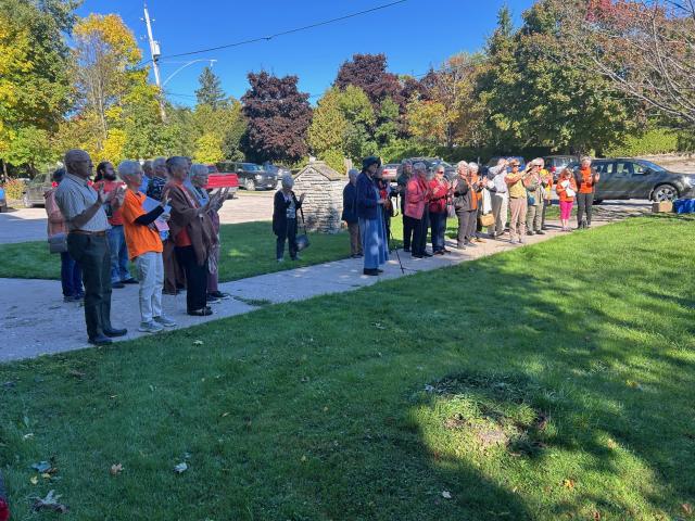 Together, we built a picnic table and painted it bright orange. A local artist put two eagle feathers and the words "Every Child Matters" on the top of the orange table. We put this in our front lawn. Our pastor took a Nishnaabemwin course and worked with the instructor to translate important phrases from English into the local dialect of Ojibwe. We made a large sign to go behind the table that has the United Church's 1986 Apology to Indigenous Peoples, the All Native Circle's response to the apology, some local history of treaties and peoples, and our dream of living in harmony as children of the Holy One. We dedicated our table at our Orange Shirt Day service and blessed it as a community. We each took A Place At The Table postcards to pass out to people to invite them to come to the table, read the sign, and talk about what truth and reconciliation mean.