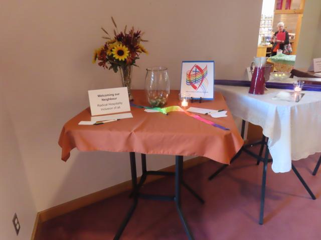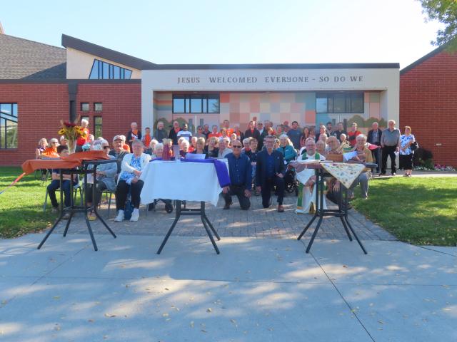As a way to embody who we are and what we believe in this centennial moment of The United Church of Canada. Rather than simply celebrating a milestone, we wanted to make our faith visible, tangible, and communal—to tell our story through art, hospitality, and shared experience. The project invited people to walk through the values that shape our life together as Prairie Spirit, as a member church of The United Church of Canada: Deep Spirituality, Bold Discipleship, and Daring Justice. By connecting these themes with the imagery of our mural—the prairie, the bread, and the rainbow (you will note also in there a QUILT pattern—something the artist proposed from the many quilt pieces we have inside the church, which resonated with us)—we expressed how faith is rooted in our place, shared in community, and open to all. The mural and tables together offered a living expression of our ministry's purpose to feed the hungry, nourish the soul, and welcome all. In a time when many feel disconnected, this was a way to reconnect people—with one another, with our story, and with God's inclusive love. Ultimately we did this to say to our congregation, our neighbours, and the wider community: "There's a place at the table for you!"