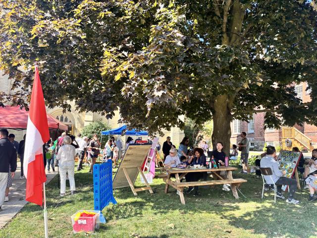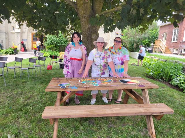 Our table has been used as a place of connection and fellowship during many community outreach events that we’ve hosted at Trinity United Church. When we launched our table at our York Pride Parade, we saw people of all different ages, abilities, sexual orientations all sit together and enjoy conversation with one another. It provided a comfortable place to sit and watch the parade and enjoy a cold glass of water or lemonade on a hot day. Since then we have also added a dog bowl with water beside the table for our furry friends. We used the table again on Canada Day, we used the table to do crafts with children from the community, which was thoroughly enjoyed by everyone who participated. On September 14 we held our annual fun fair which was attended by hundreds of families from our local community. The table allowed parents to have a place to sit while their children had fun playing the games. It also allowed parents to talk to one another, share stories and laughs.